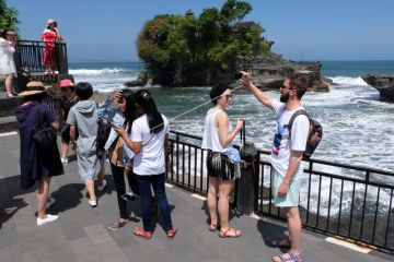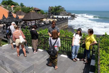 Wisatawan asing mengunjungi kawasan obyek wisata Tanah Lot di Tabanan, Bali, Sabtu (11/5/2019). Kunjungan wisatawan domestik ke sejumlah obyek wisata di Pulau Dewata mengalami penurunan sejak memasuki bulan Ramadhan dan pengaruh harga tiket pesawat yang masih tinggi. ANTARA FOTO/Nyoman Hendra Wibowo/nym/wsj.