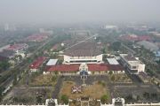 Foto udara di Kota Palangka Raya yang diselimuti kabut asap di Kalimantan Tengah, Jumat (26/7/2019). Kebakaran hutan dan lahan yang terjadi di Palangka Raya menyebabkan kabut asap yang cukup tebal disertai dengan bau asap yang sangat menyengat. ANTARA FOTO/Hafidz Mubarak A/NZ.