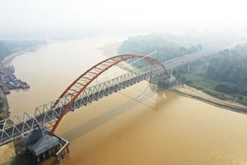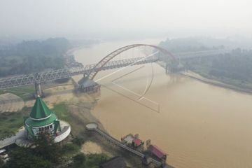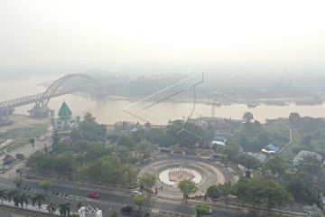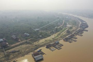 Foto udara Sungai Kahayan yang diselimuti kabut asap di Palangka Raya, Kalimantan Tengah, Jumat (26/7/2019). Kebakaran hutan dan lahan yang terjadi di Palangka Raya menyebabkan kabut asap yang cukup tebal disertai dengan bau asap yang sangat menyengat. ANTARA FOTO/Hafidz Mubarak A/nz FOTO TERKAIT