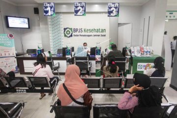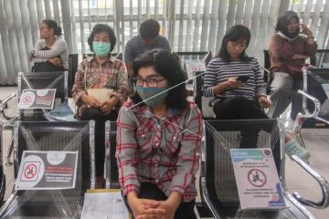 Peserta BPJS Kesehatan duduk di ruang tunggu, Palangka Raya, Kalimantan Tengah, Senin (23/3/2020). BPJS Kesehatan Palangka Raya menerapkan kebijakan pengaturan jarak (Social Distancing) melalui pemasangan tanda di ruang tunggu, guna mencegah penyebaran wabah COVID-19. ANTARA FOTO/Makna Zaezar/aww.