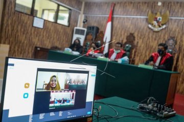 Suasana sidang yang di gelar dengan sistem telekonferensi di Pengadilan Negeri Palangka Raya, Kalimantan Tengah, Selasa (31/3/2020). Pengadilan Negeri Palangka Raya mulai hari ini menggelar sidang dengan sistem dalam jaringan (daring) atau online yang menghadirkan hakim, jaksa, pengacara dan saksi namun untuk terdakwa tetap berada di rumah tahanan (rutan), sebagai upaya mencegah penyebaran COVID-19 dengan cara menjaga jarak (Physical Distancing). ANTARA FOTO/Makna Zaezar/wsj.