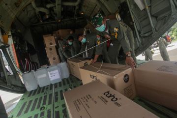 Prajurit TNI AU memindahkan kardus berisi alat kesehatan yang dikirimkan dari Lanud Halim Perdanakusuma menggunakan pesawat CN-130 di Bandara Tjilik Riwut Palangka Raya, Kalimantan Tengah, Sabtu (4/4/2020). Sebanyak tiga ribu Alat Pelindung Diri (APD) dan 15 ribu masker dikirim oleh Gugus Tugas COVID-19 untuk didistribusikan ke sejumlah rumah sakit rujukan penanganan COVID-19 di Kalimantan Tengah. ANTARA FOTO/Makna Zaezar/wsj.