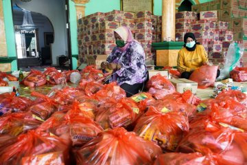 Warga menata paket sembako sebelum didistribusikan di salah satu rumah warga di Palangka Raya, Kalimantan Tengah, Kamis (16/4/2020). Bantuan penanganan virus COVID-19 dari pemerintah setempat berupa 10 ribu paket bahan pangan dan sembako tersebut akan dibagikan gratis ke warga setempat yang terdampak COVID-19. ANTARA FOTO/Makna Zaezar/aww.