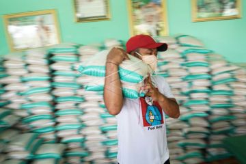 Warga mengangkat beras sebelum didistribusikan di salah satu rumah warga di Palangka Raya, Kalimantan Tengah, Kamis (16/4/2020). Bantuan penanganan virus COVID-19 dari pemerintah setempat berupa 10 ribu paket bahan pangan dan sembako tersebut akan dibagikan gratis ke warga setempat yang terdampak COVID-19. ANTARA FOTO/Makna Zaezar/aww.