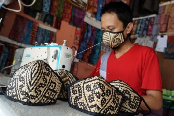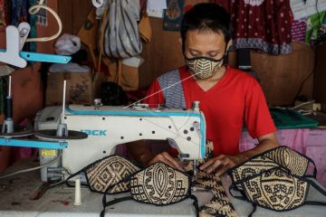 Pekerja menjahit masker berbahan dasar kain dengan lapisan rotan bermotif Dayak di kawasan Jalan G Obos Kota Palangka Raya, Kalimantan Tengah, Sabtu (2/5/2020). Masker kain dan rotan bermotif Dayak tersebut dijual dengan harga Rp60 ribu hingga Rp75 ribu per buah tergantung desain dan bahan rotannya dan dipasarkan secara daring untuk menjangkau pembeli dari berbagai tempat. ANTARA FOTO/Makna Zaezar
