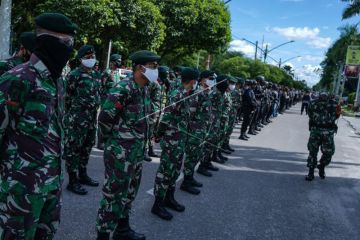 Prajurit TNI AD berbaris saat mengikuti apel gabungan persiapan penerapan Pembatasan Sosial Berskala Besar (PSBB) di Jalan Yos Sudarso, Palangka Raya, Kalimantan Tengah, Minggu (10/5/2020). PSBB kota Palangka Raya mulai diterapkan tanggal 11 Mei pukul 08.00 WIB hingga 24 Mei 2020 dengan memperketat tujuh titik akses dalam kota dan tiga titik akses masuk ke Kota Palangkaraya. ANTARA FOTO/Makna Zaezar/aww.