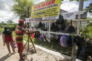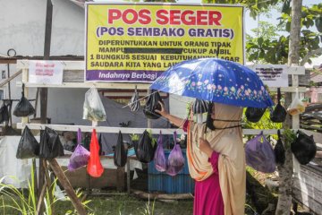 Warga mengambil paket sembako gratis di kawasan Jalan Hiu Putih, Palangka Raya, Kalimantan Tengah, Selasa (19/5/2020). Penyediaan pos sembako gratis antarwarga tersebut bertujuan untuk membantu serta meringankan beban warga yang kurang mampu dan berkurangnya penghasilan akibat virus pandemi COVID-19. ANTARA FOTO/Makna Zaezar/foc.