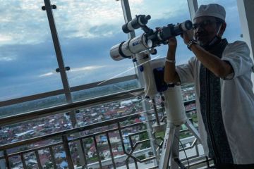 Tim Rukyatul Hilal Kanwil Kementerian Agama Provinsi Kalteng mengamati posisi hilal 1 Syawal dengan teleskop terprogram di Menara Islamic Center, Palangka Raya, Kalimantan Tengah, Jumat (22/5/2020). Pengamatan yang dilakukan di Palangka Raya tersebut tidak berhasil melihat hilal karena tertutup oleh awan serta cuaca mendung dan berdasarkan hasil sidang isbat dari Kementerian Agama di Jakarta menetapkan Hari Raya Idul Fitri 1 Syawal 1441 H jatuh pada Minggu 24 Mei 2020. ANTARA FOTO/Makna Zaezar/wsj.