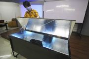 Salah satu perwakilan tim dari Universitas Dinamika (Undika) Gunawan memperlihatkan cara kerja alat sterilisasi Dinamika Box of Sterilization (D'Bos) saat diuji coba di Surabaya, Jawa Timur, Selasa (30/6/2020). Inovasi D'Bos tersebut berfungsi untuk mensterilkan barang bawaan yang masuk ke kampus atau buku-buku di perpustakaan dari virus dan bakteri dengan memanfaatkan sinar ultra vilolet (UV) tipe C. ANTARA FOTO/Moch Asim/foc.