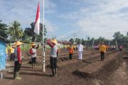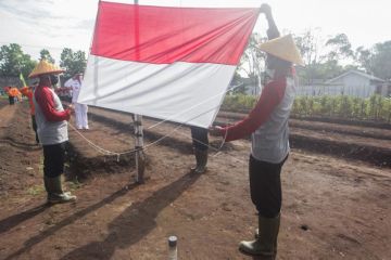 Sejumlah anggota kelompok tani sumber rejeki bertugas mengibarkan bendera Merah Putih di lahan kebun mereka di Jalan Betutu, Palangka Raya, Kalimantan Tengah, Senin (17/8/2020). Upacara pengibaran bendera Merah Putih di lahan kebun kelompok tani tersebut digelar untuk memperingati HUT ke-75 Kemerdekaan Republik Indonesia. ANTARA FOTO/Makna Zaezar/wsj.
