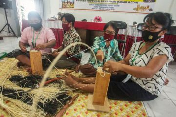 Peserta mempraktikkan cara menganyam rotan saat mengikuti pelatihan proses produksi kerajinan dengan bahan dasar rotan di Kecamatan Bukit Batu, Palangka Raya, Kalimantan Tengah, Selasa (25/8/2020). Kegiatan tersebut digelar oleh pemerintah daerah setempat untuk memberikan keterampilan memproduksi kerajinan yang dapat bersaing secara nasional dan sebagai program upaya pemulihan ekonomi di tengah pandemi COVID-19. ANTARA FOTO/Makna Zaezar/foc.