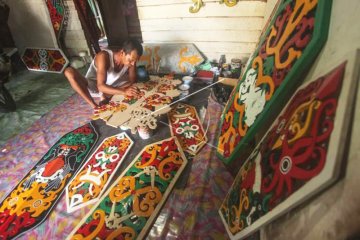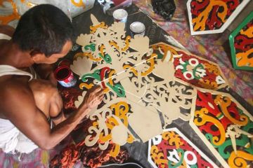 Perajin talawang, Supiyan (53) menyelesaikan pembuatan kerajinan talawang motif batang garing Dayak Kalimantan Tengah berbahan dasar kayu yang diukir di rumahnya di Jalan RTA Milono, Palangka Raya, Kalimantan Tengah, Rabu (30/9/2020). Kerajinan khas Kalteng tersebut dijual dengan harga Rp350 ribu hingga Rp30 juta tergantung jenis bahan, ukuran, dan tingkat kerumitan. ANTARA FOTO/Makna Zaezar/foc.