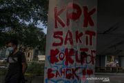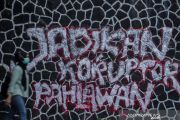 Warga melintasi mural kritik bertuliskan "Jadikan Koruptor Pahlawan" di Bandung, Jawa Barat, Senin (30/8/2021). Mural tersebut muncul diduga sebagai kritik terhadap sejumlah rencana kebijakan dan program dari lembaga anti rasuah yang dinilai melemahkan pemberantasan korupsi di Indonesia. ANTARA FOTO/Novrian Arbi/rwa.