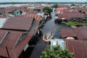 Foto udara pengendara motor melintasi permukiman yang terendam banjir di Jalan Mendawai, Palangkaraya, Kalimantan Tengah, Rabu (22/9/2021). Menurut data BPBD Kota Palangka Raya per 21 September 2021, sebanyak 17 kelurahan dari sebelumnya 13 kelurahan di kota itu terdampak banjir akibat meluasnya luapan Sungai Kahayan dan Sungai Rungan dengan tinggi 70 centimeter hingga tiga meter dalam satu minggu terakhir. ANTARA FOTO/Makna Zaezar/wsj.