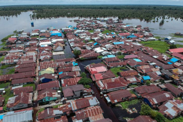 Foto udara permukiman warga terendam banjir di Jalan Mendawai, Palangka Raya, Kalimantan Tengah, Rabu (22/9/2021). Menurut data BPBD Kota Palangkaraya per 21 September 2021, sebanyak 17 kelurahan dari sebelumnya 13 kelurahan di kota itu terdampak banjir akibat meluasnya luapan Sungai Kahayan dan Sungai Rungan dengan tinggi 70 centimeter hingga tiga meter dalam satu minggu terakhir. ANTARA FOTO/Makna Zaezar/wsj.