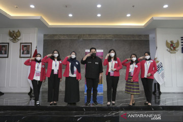 Menteri BUMN Erick Thohir (tengah) berfoto bersama peserta program Girls Take Over di Kementerian BUMN, Jakarta, Senin (27/9/2021). Program Girls Take Over telah memilih enam perempuan muda dari seluruh Indonesia yang akan menjadi Menteri BUMN dan lima direktur utama BUMN dalam satu hari yang merupakan bagian dalam transformasi human capital BUMN guna mendorong peningkatan kepemimpinan muda dan perempuan. ANTARA FOTO/Dhemas Reviyanto/hp.