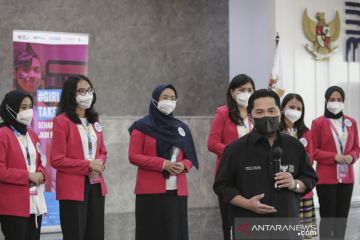 Menteri BUMN Erick Thohir menyampaikan keterangan pers terkait program Girls Take Over di Kementerian BUMN, Jakarta, Senin (27/9/2021). Program Girls Take Over telah memilih enam perempuan muda dari seluruh Indonesia yang akan menjadi Menteri BUMN dan lima direktur utama BUMN dalam satu hari yang merupakan bagian dalam transformasi human capital BUMN guna mendorong peningkatan kepemimpinan muda dan perempuan. ANTARA FOTO/Dhemas Reviyanto/hp.