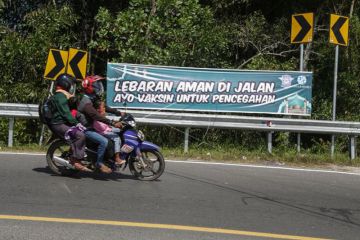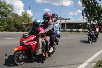 Pemudik bersepeda motor melintas di jalan Trans Kalimantan Tengah Poros Selatan, Palangka Raya, Kalimantan Tengah, Sabtu (30/4/2022). Memasuki H-2 Lebaran, arus lalu lintas kendaraan pemudik di jalan nasional Kalteng dari arah Palangka Raya menuju sejumlah kabupaten di Kalteng dan Provinsi Kalimantan Selatan tersebut terpantau mengalami peningkatan serta diprediksi akan terus bertambah hingga H-1 Idul Fitri. ANTARA FOTO/Makna Zaezar/tom.