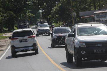 Kendaraan pemudik melintas di jalan Trans Kalimantan Tengah Poros Selatan, Palangka Raya, Kalimantan Tengah, Sabtu (30/4/2022). Memasuki H-2 Lebaran, arus lalu lintas kendaraan pemudik di jalan nasional Kalteng dari arah Palangka Raya menuju sejumlah kabupaten di Kalteng dan Provinsi Kalimantan Selatan tersebut terpantau mengalami peningkatan serta diprediksi akan terus bertambah hingga H-1 Idul Fitri. ANTARA FOTO/Makna Zaezar/tom.