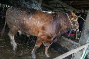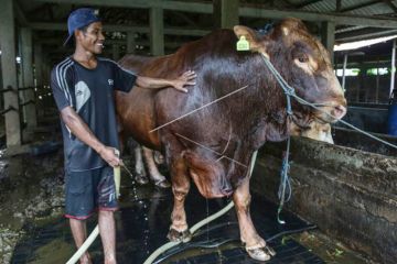 Peternak memandikan sapi yang dibeli Presiden Joko Widodo untuk dikurbankan pada Idul Adha di Kalteng, Palangka Raya, Kalimantan Tengah, Kamis (7/7/2022). Presiden membeli sapi jenis limosin seberat 1,1 ton untuk disembelih pada Hari Raya Idul Adha 1443 H mendatang di Masjid Jami Assalam Sampit Kabupaten Kotawaringan Timur Kalteng. ANTARA FOTO/Makna Zaezar/rwa.
