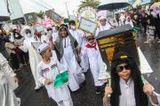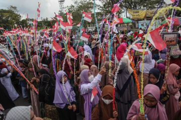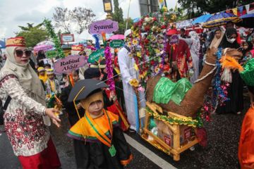 Sejumlah peserta mengikuti pawai menyambut Tahun Baru Islam 1 Muharram 1444 Hijriah di kawasan Jalan AIS Nasution, Palangka Raya, Kalimantan Tengah, Jumat (29/7/2022). Pawai yang digelar oleh Pemerintah Kota Palangka Raya tersebut diikuti ribuan siswa guna menyambut Tahun Baru Islam 1444 H yang jatuh pada 30 Juli 2022 sekaligus memperkenalkan tahun hijriah kepada pelajar. ANTARA FOTO/Makna Zaezar/foc.