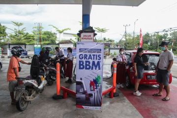 Petugas mengisi bahan bakar minyak (BBM) jenis Pertamax secara gratis ke sepeda motor dan mobil konsumen di SPBU Yos Sudarso, Palangka Raya, Kalimantan Tengah, Rabu (17/8/2022). PT Pertamina (Persero) Patra Niaga Regional Kalsel-Teng memberikan program bbm gratis jenis Pertamax dan Dexlite selama tiga hari untuk masyarakat di kota tersebut dalam rangka memeriahkan HUT ke-77 Kemerdekaan RI. ANTARA FOTO/Makna Zaezar/hp.