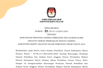 ANTARA - Rancangan penataan daerah pemilihan alokasi kursi anggota DPRD Kabupaten Barito Selatan dalam Pemilihan Umum Tahun 2024, untuk mendapatkan tanggapan dan masukan masyarakat sebagaimana tercantum dalam lampiran ini.