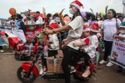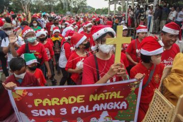 Sejumlah peserta mengikuti Parade Natal 2022 di Stadion Sanaman Mantikei, Palangka Raya, Kalimantan Tengah, Sabtu (3/12/2022). Usai ditiadakan dua tahun akibat pandemi COVID-19, parade dalam rangka menyambut Hari Raya Natal 2022 itu kembali digelar dengan diikuti ribuan peserta dari pelajar, mahasiswa, dan seluruh elemen masyarakat umat kristiani di Kota Palangka Raya. ANTARA FOTO/Makna Zaezar/hp.