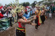 Sejumlah peserta menampilkan tarian adat Dayak Kalimantan Tengah saat mengikuti Parade Natal 2022 di Stadion Sanaman Mantikei, Palangka Raya, Kalimantan Tengah, Sabtu (3/12/2022). Usai ditiadakan dua tahun akibat pandemi COVID-19, parade dalam rangka menyambut Hari Raya Natal 2022 itu kembali digelar dengan diikuti ribuan peserta dari pelajar, mahasiswa, dan seluruh elemen masyarakat umat kristiani di Kota Palangka Raya. ANTARA FOTO/Makna Zaezar/hp.