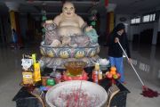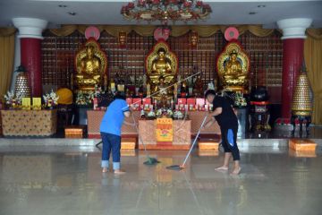 Anggota Indonesian Housekeepers Association (IHKA) Bogor mengepel lantai saat aksi bersih (Cleaning Blitz) di Vihara Buddhasena, Kota Bogor, Jawa Barat, Selasa (17/1/2023). Badan Pimpinan Cabang IHKA Bogor mengadakan kegiatan sosial membersihkan vihara tersebut dalam rangka menyambut Tahun Baru Imlek 2574 sekaligus untuk menjalin kebersamaan antar umat beragama. ANTARA FOTO/Arif Firmansyah/hp.