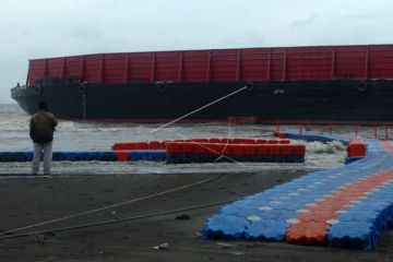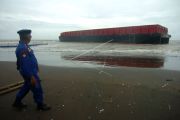 Personel Polairud mengamati kapal Tongkang yang terdampar di obyek wisata Pantai Alam Indah, Tegal, Jawa Tengah, Kamis (23/2/2023). Kapal tongkang pengangkut batubara itu terdampar akibat angin kencang dan gelombang tinggi. ANTARA FOTO/Oky Lukmansyah/rwa.