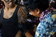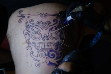 Seorang peserta lomba membuat tato di punggung model di Rumah Radakng, Pontianak, Kalimantan Barat, Selasa (23/5/2023). Lomba membuat tato Dayak yang digelar untuk memeriahkan Pekan Gawai Dayak ke-37 tersebut bertujuan memperkenalkan seni rajah tubuh khas Dayak Kalimantan kepada masyarakat. ANTARA FOTO/Jessica Helena Wuysang/tom.