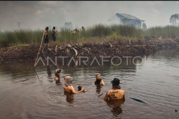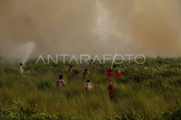 Satgas gabungan pemadam kebakaran hutan dan lahan (karhutla) berupaya memadamkan api yang membakar hutan dan lahan di Kelurahan Petuk Katimpun, Palangka Raya, Selasa (29/8/2023). Petugas gabungan masih terus berupaya memadamkan kebakaran hutan dan lahan yang terjadi di daerah tersebut. ANTARA FOTO/Auliya Rahman/tom.