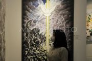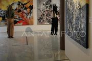 Pengunjung mengamati lukisan saat pameran Solo Exhibition Karya P Lampang ke-VIII di UPT Taman Budaya Kalimantan Tengah, Palangka Raya, Kamis (19/10/2023). Pameran tunggal tersebut menampilkan 100 karya seni rupa berupa lukisan, bertema musim bunga yang bermekaran dan eksplorasi abstrak yang membagikan rasa rupa keindahan. ANTARA FOTO/Auliya Rahman/Spt.