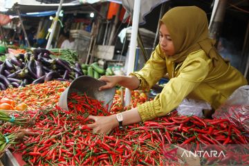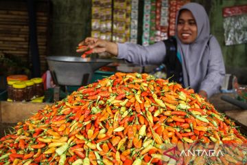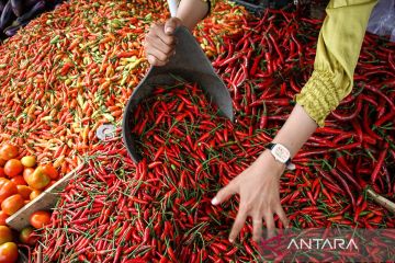 Pedagang menimbang cabai rawit di Pasar Besar Palangka Raya, Kalimantan Tengah, Senin (26/2/2024). Menurut pedagang, harga cabai di pasar tersebut mengalami kenaikan, seperti cabai keriting dari Rp60 ribu menjadi Rp90 ribu per kilogram dan cabai merah besar yang sebelumnya Rp60 menjadi Rp80 ribu per kilogram yang disebabkan kurangnya pasokan. ANTARA FOTO/Auliya Rahman/tom.