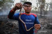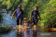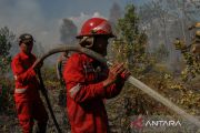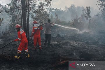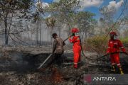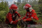 Sejumlah relawan pemadam kebakaran berupaya memadamkan sisa api yang membakar lahan gambut di Kelurahan Kalampangan, Palangka Raya, Kalimantan Tengah, Minggu (4/8/2024). Berdasarkan data dari Badan Penanggulangan Bencana dan Pemadam Kebakaran (BPBPK) Provinsi Kalimantan Tengah luas lahan yang terbakar dari 1 Januari hingga 3 Agustus 2024 seluas 384,85 hektare dari 193 kejadian karhutla. ANTARA FOTO/Auliya Rahman/tom.