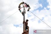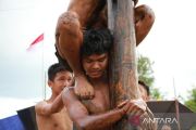 Sejumlah warga bahu membahu memanjat batang pohon pinang saat mengikuti lomba kemerdekaan di Kelurahan Menteng, Palangka Raya, Kalimantan Tengah, Sabtu (17/8/2024). Perlombaan tersebut diinisiasi oleh masyarakat setempat dalam rangka memeriahkan peringatan HUT ke-79 Kemerdekaan Republik Indonesia. ANTARA FOTO/Auliya Rahman.