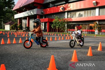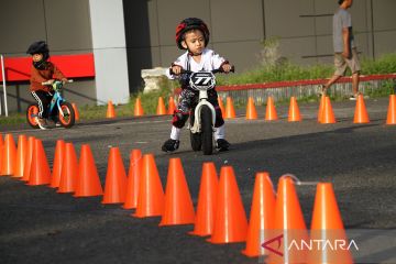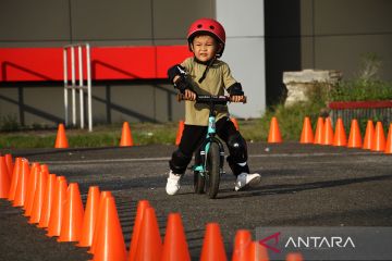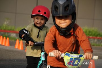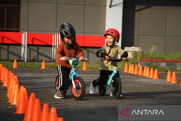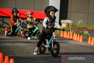 Sejumlah anak memacu sepedanya saat berlatih sepeda dorong atau push bike di pelataran Stadion Tuah Pahoe, Palangka Raya, Kalimantan Tengah, Kamis (24/10/2024). Latihan sepeda dorong oleh komunitas Push Bike Palangka Raya tersebut sebagai wadah anak usia dini untuk melatih konsentrasi dan keseimbangan guna menunjang tumbuh kembang anak sekaligus untuk mencari bibit atlet. ANTARA FOTO/Auliya Rahman.