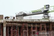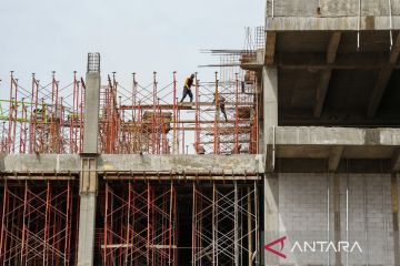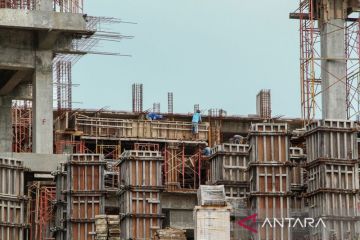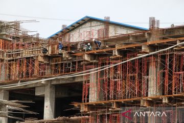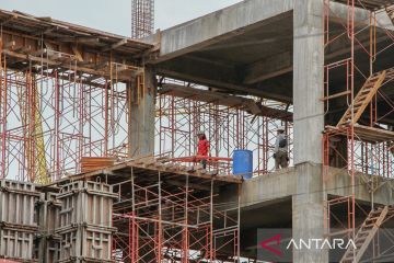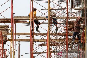Sejumlah pekerja menyelesaikan pembangunan mal di Palangka Raya, Kalimantan Tengah, Senin (9/12/2024). Pemerintah Provinsi Kalimantan Tengah menetapkan Upah Minimum Provinsi (UMP) pada Tahun 2025 Rp3.473.621,04 naik senilai Rp212.005,04 atau 6,5 persen dari UMP Tahun 2024 Rp3.261.616,00. ANTARA FOTO/Auliya Rahman.