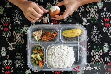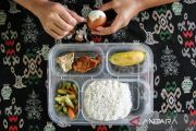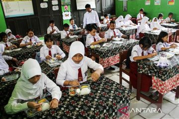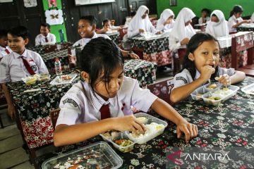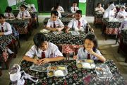 Sejumlah siswa berdoa sebelum menikmati makan bergizi gratis di SD Negeri 1 Bukit Tunggal, Palangka Raya, Kalimantan Tengah, Senin (13/1/2025). Pelaksanakan makan bergizi gratis tahap pertama di daerah tersebut mendistribusikan untuk 3.039 sasaran siswa dari 16 sekolah yang terdiri dari TK, SD, SMP, dan SMA ANTARA FOTO/Auliya Rahman.