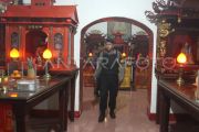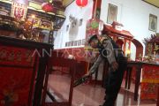 Anggota polisi melakukan sterilisasi di altar Kelenteng Sien Hien Kiong, Ngawi, Jawa Timur, Selasa (28/1/2025). Polres Ngawi menerjunkan puluhan personel untuk melakukan pengamanan di malam perayaan Tahun Baru Imlek termasuk sterilisasi kelenteng dan meningkatkan patroli di sejumlah titik. ANTARA FOTO/Ari Bowo Sucipto/foc.