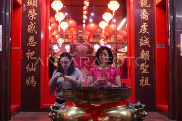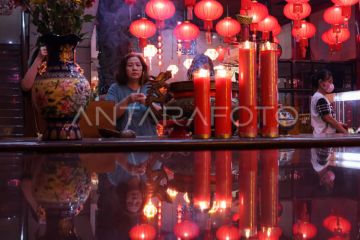 Warga keturunan Tionghoa melaksanakan ibadah di Kelenteng Xian Ma Makassar, Sulawesi Selatan, Selasa (28/1/2025). Ibadah malam pergantian Tahun Baru Imlek 2576 Kongzili tersebut sebagai ungkapan rasa syukur atas berkah yang telah didapatkan sekaligus memanjatkan doa agar diberikan keselamatan dan kehidupan yang lebih baik di Tahun Ular Kayu. ANTARA FOTO/Arnas Padda/foc.