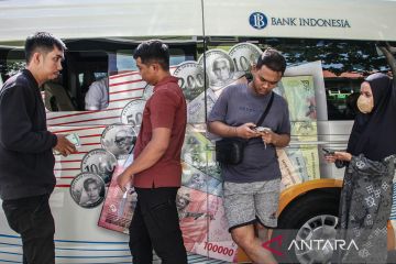 Warga menukarkan uang di mobil kas keliling Bank Indonesia di Palangka Raya, Kalimantan Tengah, Rabu (5/3/2025). Kantor Perwakilan Bank Indonesia Provinsi Kalimantan Tengah melayani penukaran uang pecahan kecil mulai dari Rp1000, Rp2 ribu, Rp5 ribu, Rp10 ribu, Rp20 ribu, dan Rp50 ribu untuk memenuhi kebutuhan masyarakat saat bulan Ramadhan dan menyambut Hari Raya Idul Fitri 1446 H. ANTARA FOTO/Auliya Rahman