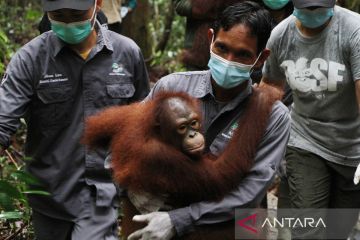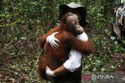 Menteri Kehutanan Raja Juli Antoni menggendong anak Orang Utan subspecies Wurmbii (Pongo Pygmaeus Wurmbii) saat mengantarkan ke tempat sekolah Orang Utan di kawasan Rehabilitasi dan Konservasi Nyaru Menteng, Palangka Raya, Kalimantan Tengah, Kamis (20/3/2025). Dalam kunjungan tersebut, Menhut meresmikan sekolah Orang Utan Nyaru Menteng milik Yayasan Borneo Orang Utan Survival Foundation (BOSF) yang merupakan tempat sekolah bagi anak-anak Orang Utan sebelum dilepasliarkan ke habitatnya. ANTARA FOTO/Auliya Rahman/rwa.