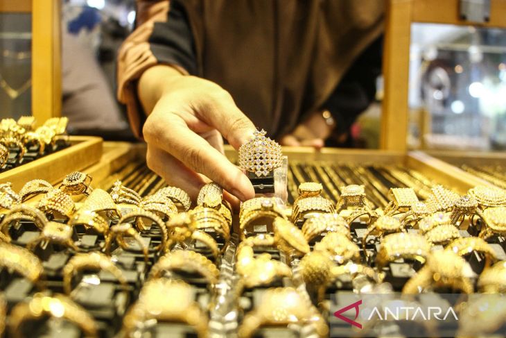 Pedagang menata perhiasan emas di salah satu toko emas di Pasar Besar, Palangka Raya, Kalimantan Tengah, Senin (14/4/2025). Menurut pedagang, harga perhiasan emas di Palangka Raya mengalami kenaikan dibanding pekan lalu yang terdiri dari emas kadar 99 dari kisaran harga Rp 1.700.000 menjadi Rp 1.800.000 per gram, emas kadar 700 dari kisaran harga Rp 1.250.000 menjadi Rp 1.350.000 per gram, dan emas kadar 375 dari kisaran harga Rp 650.000 menjadi Rp 750.000 per gram. ANTARA FOTO/Auliya Rahman/tom.