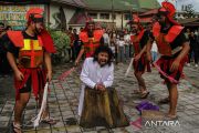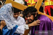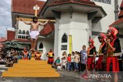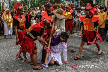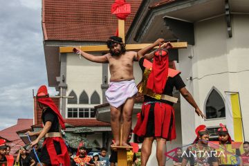 Umat Katolik memperagakan drama penyaliban Yesus Kristus dalam Tablo Jalan Salib di Gereja Katedral, Palangka Raya, Kalimantan Tengah, Jumat (18/4/2025). Drama penyaliban yang menggambarkan peristiwa penderitaan Yesus hingga wafat di kayu salib tersebut merupakan rangkaian ibadah Jumat Agung. ANTARA FOTO/Auliya Rahman/tom.