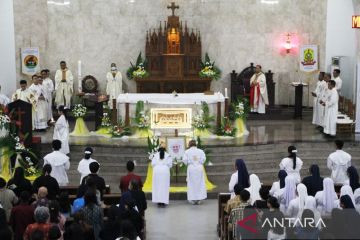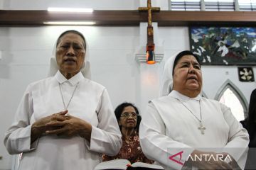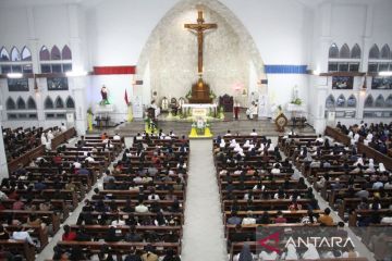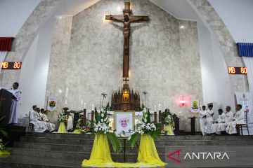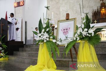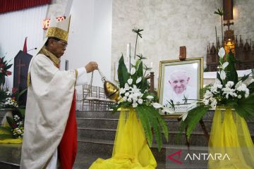 Umat Katolik melaksanakan Misa Requiem di Gereja Katedral Santa Maria, Palangka Raya, Kalimantan Tengah, Selasa (22/4/2025). Misa Requiem dilaksanakan untuk mendoakan Pemimimpin tertinggi Gereja Katolik sedunia sekaligus Kepala Negara Vatikan Paus Fransiskus yang meninggal dunia di usia 88 tahun pada hari senin (21/4). ANTARA FOTO/Auliya Rahman/nz.