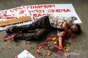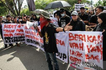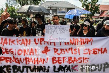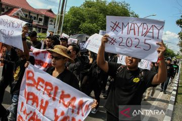 Pengunjuk rasa menyampaikan aspirasinya saat memperingati Hari Buruh Internasional di depan kantor Gubernur Kalimantan Tengah, Palangka Raya, Kamis (1/5/2025). Mereka menuntut kenaikan upah minimum regional, tolak sistem outsourching dan kontrak seumur hidup, serta mengevaluasi dan audit berkala terhadap standar operasional prosedur kesehatan dan keselamatan kerja perusahaan. ANTARA FOTO/Auliya Rahman.