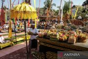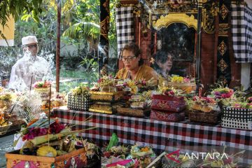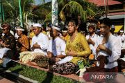 Umat Hindu bersembahyang bersama saat Hari Raya Kuningan di Pura Pitamaha, Palangka Raya, Kalimantan Tengah, Sabtu (3/5/2025). Umat Hindu Palangka Raya melakukan persembahyangan pada Hari Raya Kuningan yang merupakan rangkaian dari Hari Raya Galungan atau perayaan kemenangan kebenaran (Dharma) melawan atas Kejahatan (Adharma). ANTARA FOTO/Auliya Rahman.