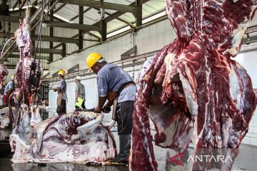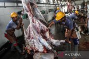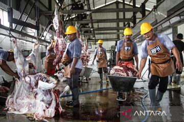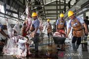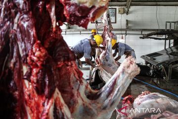 Pekerja memotong daging sapi kurban milik warga yang dipotong di UPTD Rumah Potong Hewan (RPH) Palangka Raya, Kalimantan Tengah, Jumat (6/6/2025). Rumah Potong Hewan tersebut melayani pemotongan hewan kurban dari masyarakat hingga Senin (9/6) dan tercatat pada hari pertama bertepatan dengan Idul Adha 1446 H sekitar 170 ekor hewan kurban disembelih di tempat tersebut. ANTARA FOTO/Auliya Rahman/nym.